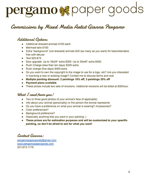 *Please send me a message upon purchasing with what you would like included in your painting as well as 2-3 images of your animal - pergamopapergoods@gmail.com*
